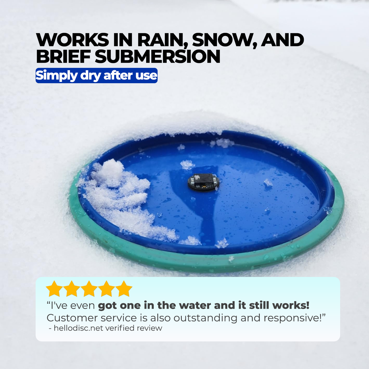 Brand new for 2025, HelloDisc Ultralight is a new disc golf tracker, featuring a sleek design, improved volume, rock-solid durability, custom-fit tape, and incredible battery life.